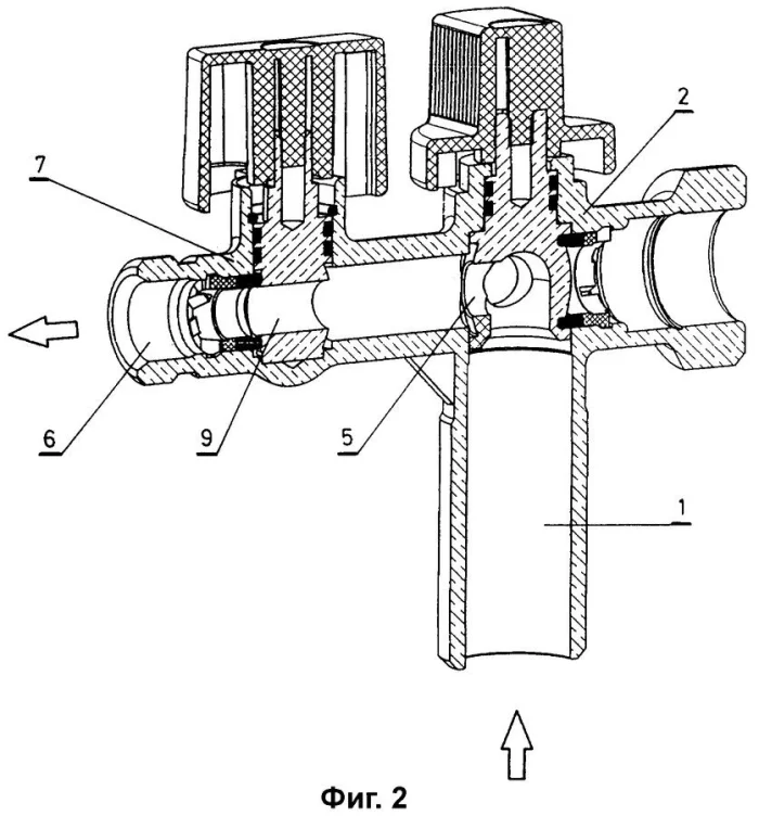 - Вкрутите клапан в верхний вход радиатора (по направлению потока, указанному стрелкой на корпусе). Термоголовка должна располагаться горизонтально.