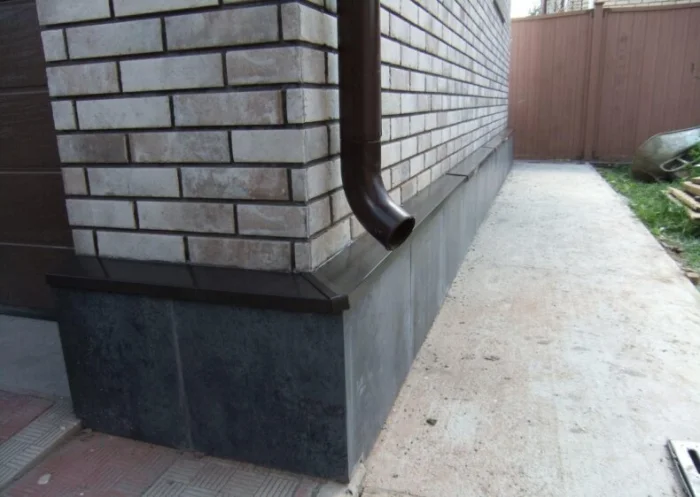 Самый распространенный случай. Отлив крепится к стене прямо над цоколем. Важно, чтобы нижняя его полка плотно прилегала к поверхности цоколя, а верхняя была надежно зафиксирована и загерметизирована на стене. Зазор — враг.