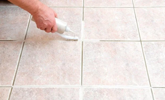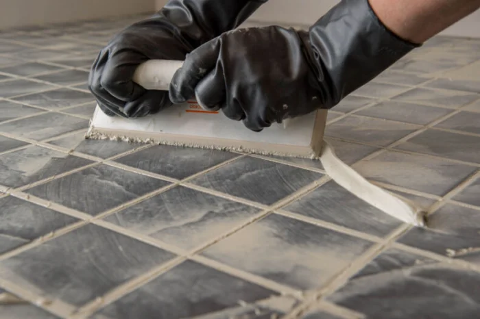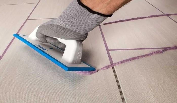 - Резиновым шпателем втираем смесь в швы, хорошо заполняя. Начните с наименее заметного угла, чтобы набить руку.