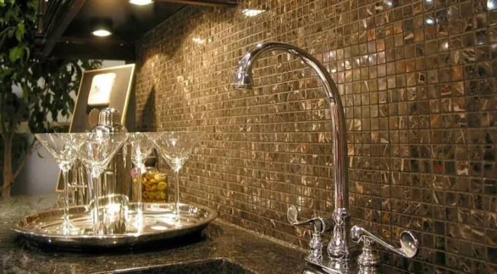 Знакомый всем кафель, только в миниатюре. По сути, это множество маленьких фрагментов обычной плитки. Ее плюсы проверены временем: не боится воды, жары, имеет огромный выбор расцветок и фактур (глянец, мат, камень). Служить будет десятилетиями. А выглядит такая мозаика всегда солиднее и богаче, чем ее крупноформатные собратья.