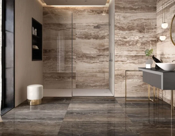 Керамогранит — вот настоящий тяжеловес. Этот аналог часто превосходит натуральный камень по твердости, а по красоте не уступает. Идеальный кандидат для пола в местах с повышенной влажностью: