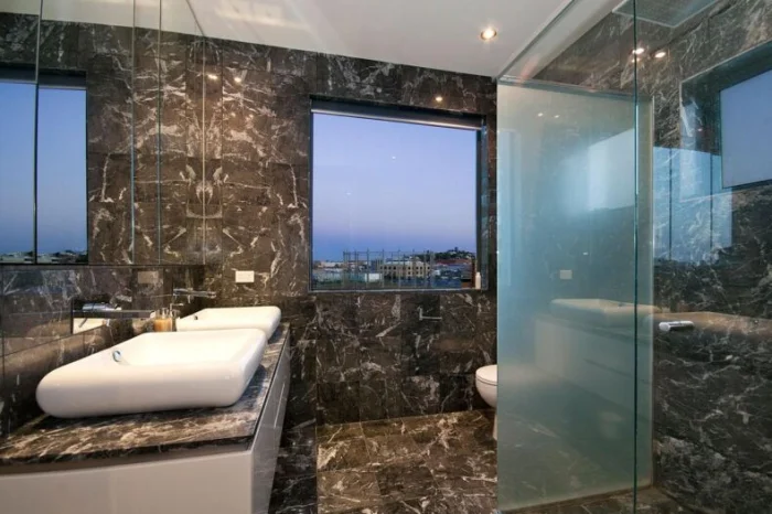Имитация натурального камня дарит интерьеру благородство и роскошь. Она одинаково великолепно смотрится и в строгой классической ванной, и в смелом санузле в стиле модерн.