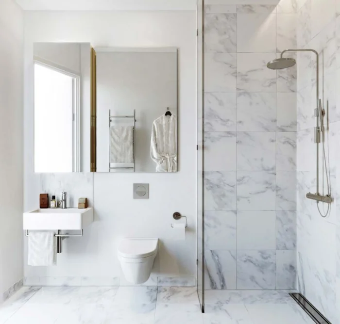 Любой оттенок мраморной плитки хорош, но пальму первенства прочно удерживают белый и светло-серый с деликатными прожилками. Выглядит свежо, чисто и визуально расширяет пространство.