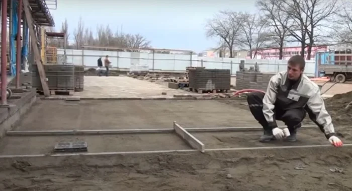 Насыпьте слой песка (5-7 см) или сухой цементно-песчаной смеси (гарцовки). Разровняйте правилом или длинной ровной доской, чтобы получить идеально ровную плоскость с нужным уклоном. Затем обильно пролейте водой из шланга с распылителем и снова утрамбуйте. Это основа для плитки, и она должна быть жёсткой.