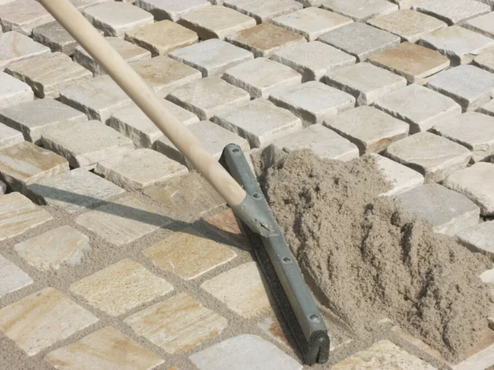 Когда вся плитка уложена, самое время зафиксировать её. Рассыпьте по поверхности сухой просеянный песок (или ту же гарцовку) и прометите его жёсткой щёткой во все швы. Делайте это тщательно, пока все пустоты не заполнятся. Затем аккуратно пролейте дорожку водой. Песок в швах уплотнится, при необходимости досыпьте ещё. Этот слой скрепит всё покрытие в монолит.