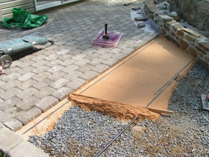 - Песчаное. Самый простой и дышащий вариант. На утрамбованный песок укладывается плитка. Отлично подходит для сухих, стабильных грунтов и пешеходных дорожек. Главный плюс — великолепный дренаж.