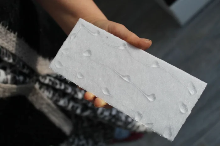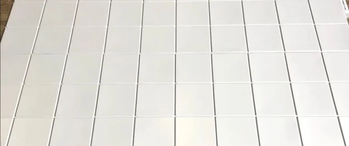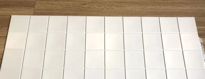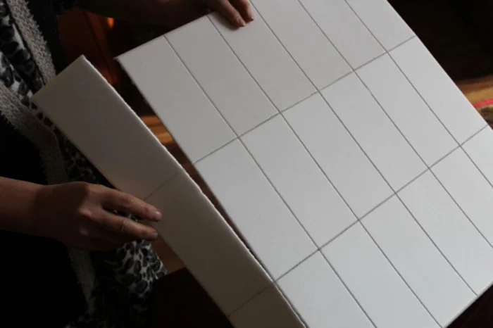 Клей наносится тонким слоем на тыльную сторону плитки. Резать материал проще простого — обычными острыми ножницами или строительным ножом.