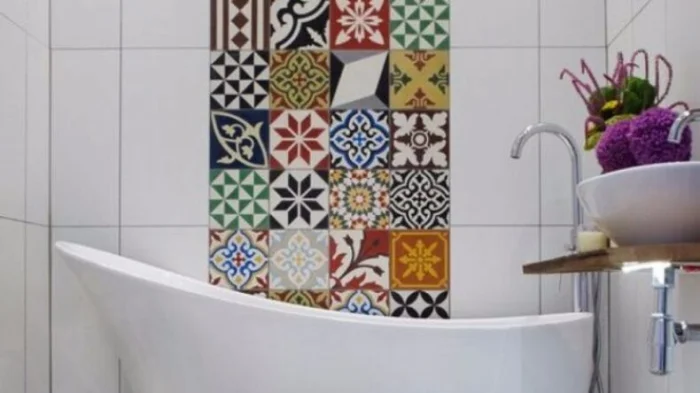 Если надоел не узор, а именно цвет плитки, её можно перекрасить полностью. Используйте валик для больших поверхностей и кисть для швов. Но будьте осторожны: в зонах прямого попадания воды (около душа, раковины) краска может со временем отслоиться.