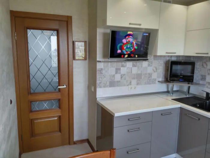 - Скруглите острый угол столешницы у входа — так будет безопаснее и визуально мягче.