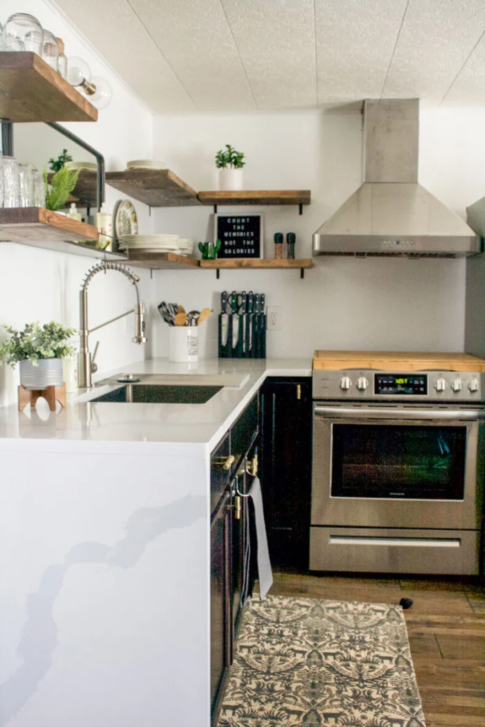 - Свободная столешница. Всё, что можно повесить — вешаем. Всё, что можно убрать — убираем. Порядок визуально добавляет места.