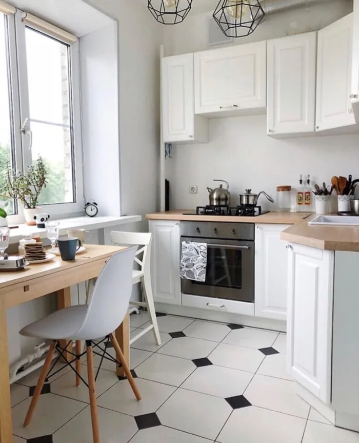 Скандинавский стиль — тот же светлый фон, но допускает больше уюта: деревянные акценты, неброский текстиль в клетку, керамика. Можно добавить пару ярких деталей — жёлтый чайник или зелёное растение.