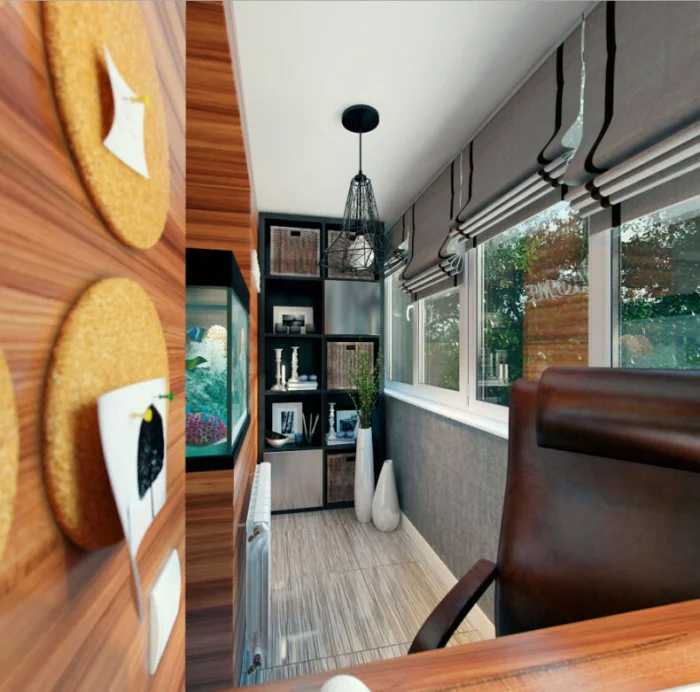 Пробковую стену так и хочется потрогать. Это отличный выбор для балкона-кабинета или зоны отдыха, где важна тишина и особая атмосфера.