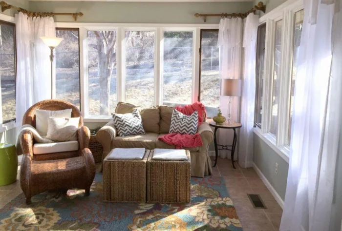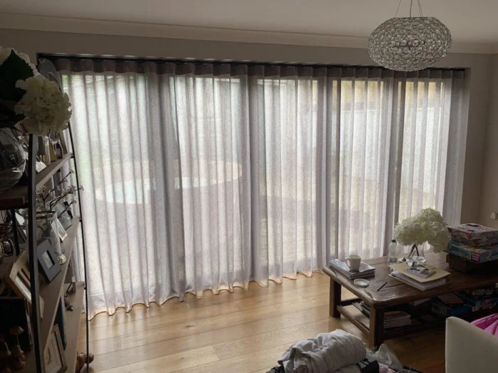 - Воздушная графика. Перекрещенные прозрачные полотна, крепящиеся статично. Они не двигаются, но создают игру света и тени, мягко рассеивая солнце. Очень современно и красиво.