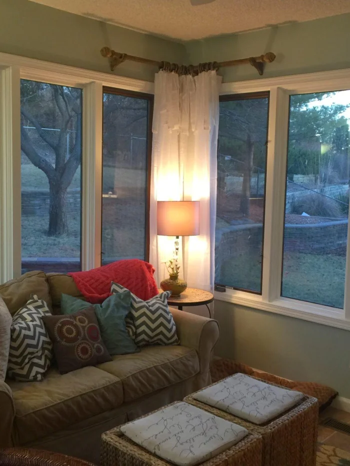 - Карниз нужно крепить выше окна. Идеально — на 20-40 см от верхней границы проёма. Это моментально «поднимает» потолок.