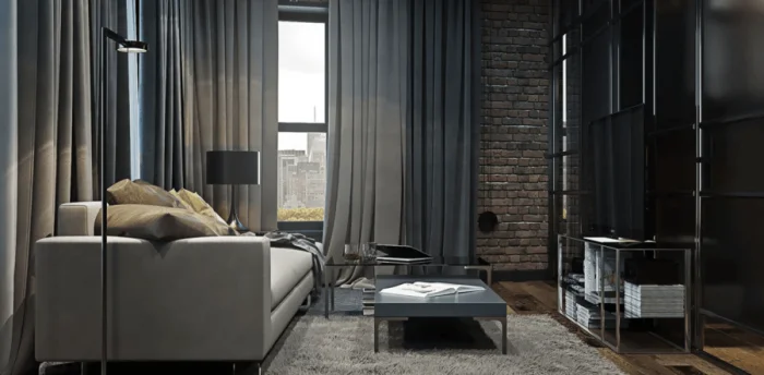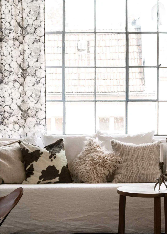 Обратите внимание на шторы на люверсах (металлических кольцах). Они нанизаны на карниз-трубу и создают красивые, равномерные складки. Это одновременно и брутально, и элегантно. Подходит и для плотного льна, и для лёгкого тюля.