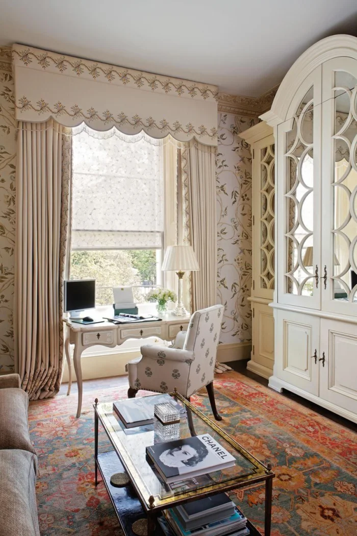 - Вечная классика. Тюль плюс плотные портьеры. Работает всегда, особенно в гостиной или спальне. Ламбрекены? Раньше они были пышными, сейчас — это лаконичная прямоугольная полоска. Никакой «захламлённости», только акцент на красоте окна.