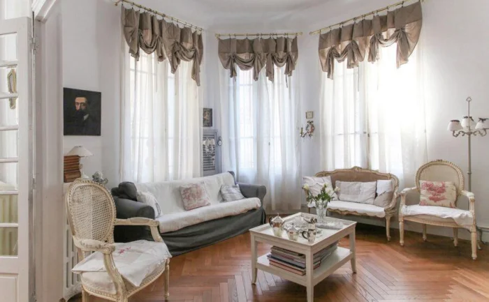 - Итальянская романтика. Штора не разъезжается в стороны, а драпируется по диагонали с помощью бокового шнура. Невероятно изящно и чувственно. Идеально для спальни, где хочется особого настроения.
