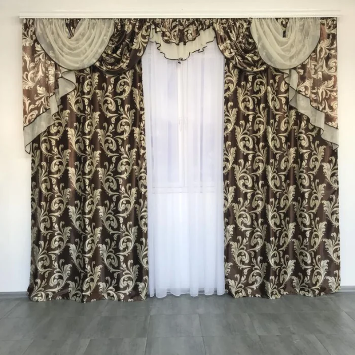 Кстати, ламбрекен и портьеры не обязаны быть из одного материала! Если шторы сшиты из тяжёлого жаккарда, то мягкие сваги можно сделать из струящегося атласа в тон, украсив лёгкими складками.