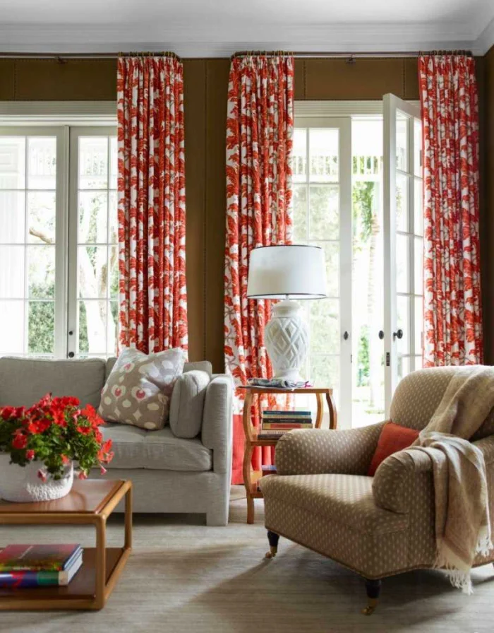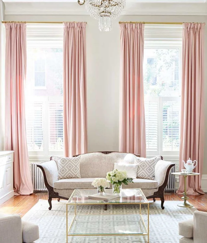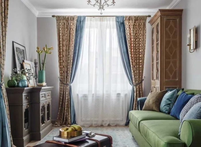 - Учитывайте реалии комнаты: освещение, размер, отделку. Тяжёлый бархат в маленькой тёмной гостиной — плохая идея.