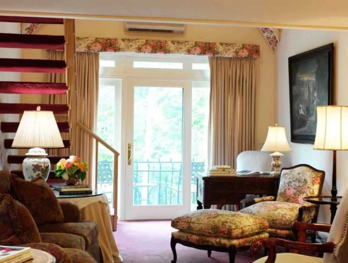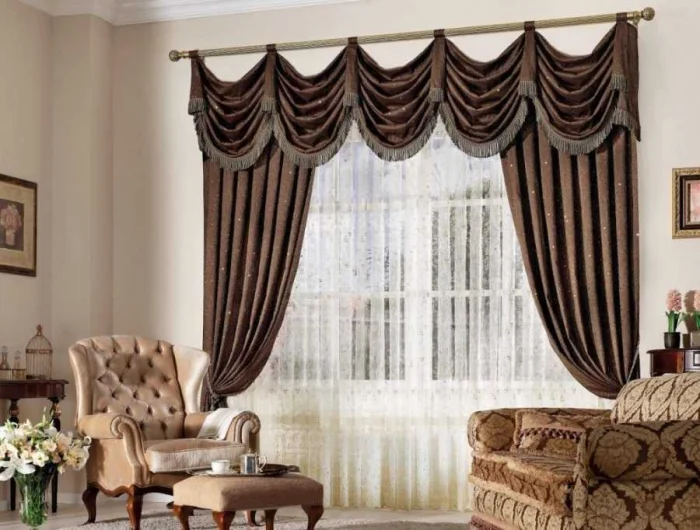 - Классика. Тяжёлые, благородные ткани: бархат, парча. Допустимы роскошные детали: ламбрекены, бахрома, вышивка. Фасоны: французские, австрийские, римские.