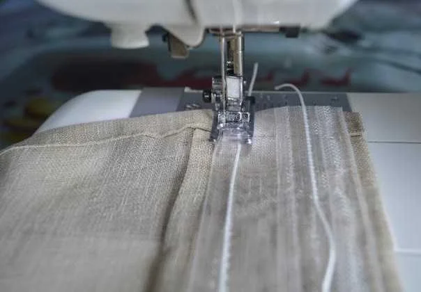 - Верхний край удобно обрабатывать, сразу пришивая шторную ленту. Это и быстро, и красиво — верхний шов окажется внутри.