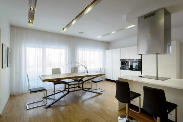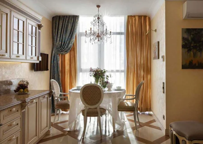 Для стиля минимализм идеальны лаконичные рулонные или римские шторы. А вот в просторной кухне-классике можно позволить себе и воздушный тюль, и плотные портьеры.