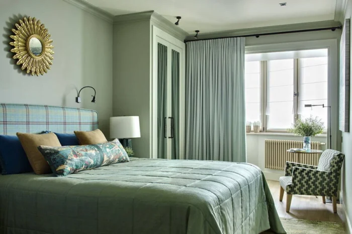 Шторы — ваш главный союзник в зонировании. Плотные портьеры на балконной части создадут уединение, лёгкий тюль — оставит ощущение простора. В маленькой спальне 12 кв.м. этот приём просто спасение.