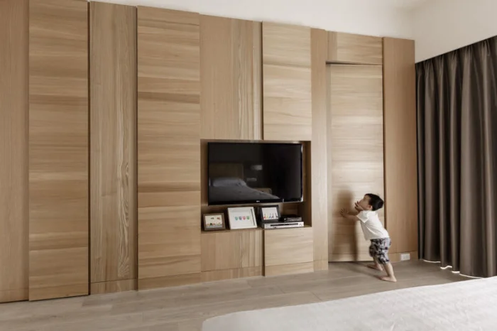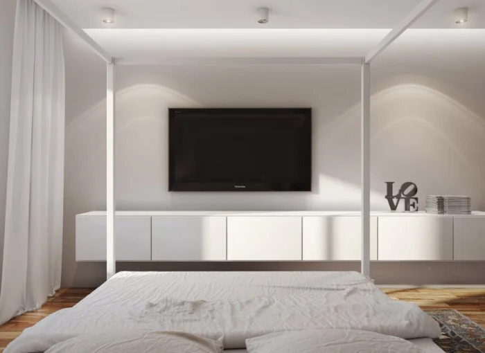 Самый удачный вариант — повесить телевизор так, чтобы его центр был чуть выше уровня ваших глаз, когда вы лежите. Голова при этом должна оставаться в естественном положении — без запрокидывания и без лишней подушки под шеей. Иногда телевизор встраивают в мебель, например, в стенку-купе со специальной нишей. Это тоже отличное решение.