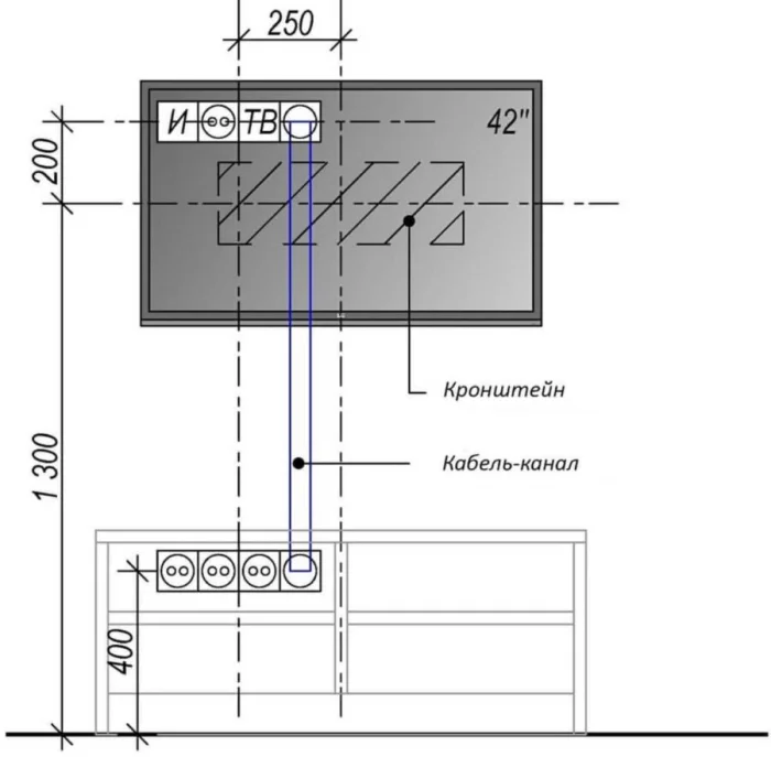 Для спальни, где смотрят лежа, оптимальная высота розетки — около 2 метров от пола. Ориентируйтесь на центр экрана: он должен быть на уровне глаз, а розетка — аккуратно скрываться за ним.