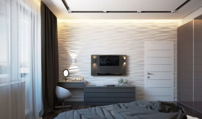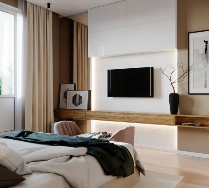 Телевизор в спальне — уже давно не роскошь, а почти что предмет гигиены сна. Ну правда, как иногда хочется полежать и посмотреть что-нибудь перед сном! Современные плоские панели мы обычно вешаем на стену — так и пространство экономится, и смотреть из кровати куда удобнее. Но вот вопрос: на какой именно высоте?