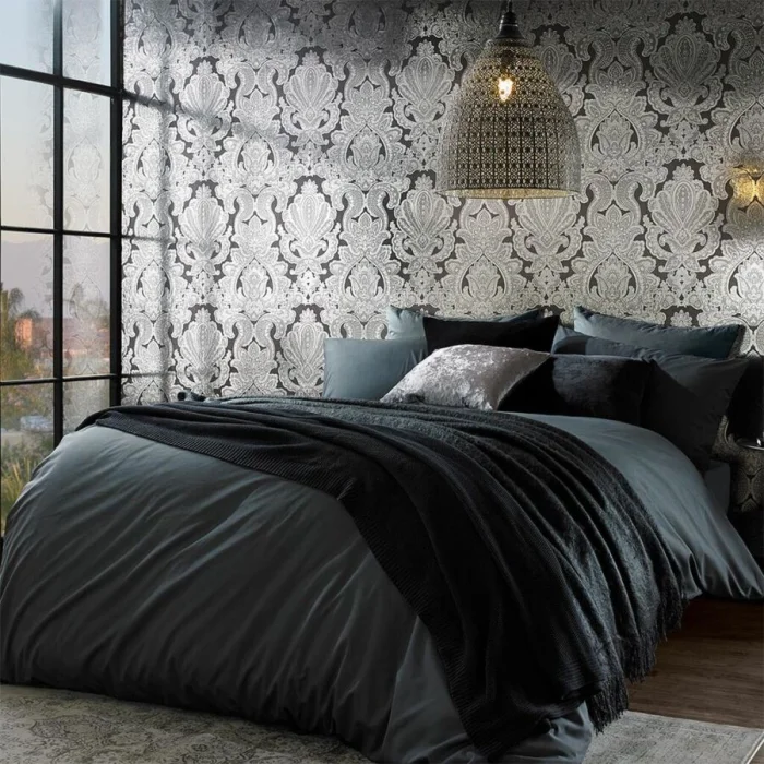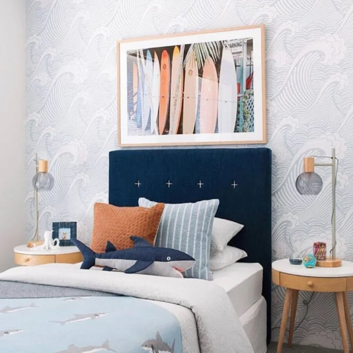 Глянцевая поверхность таких обоев будет отражать свет, усиливая ощущение свежести и простора. Лёгкий холодок в интерьере — вот что нужно для комфортного сна в жаркую ночь.