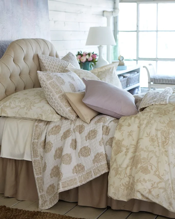 - Стёганое. Два слоя ткани с тонким утеплителем между ними. Может быть простым или с изящной каретной стяжкой. Кстати, такое покрывало — отличный проект для начинающей швеи. Ткани нужно немного больше, чем для обычного, а результат выглядит по-домашнему уютно.