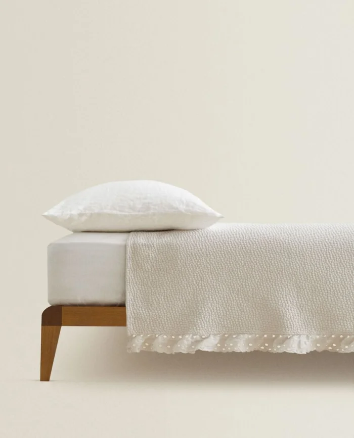 Есть элегантный выход: использовать покрывало, которое заправляется под матрас, как простыня. В общем, для большой кровати лучше подходят плотные, хорошо драпирующиеся материалы, а для односпальной — более лёгкие и воздушные.