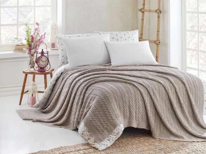 - Скандинавский стиль. Шерстяные или стёганые покрывала светлых, природных тонов. Акцент на простоту, натуральность и фактуру.