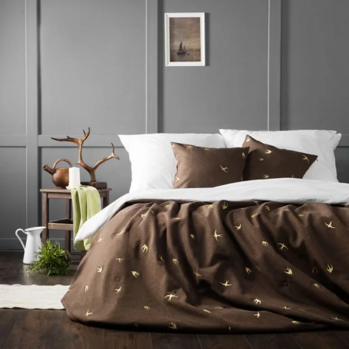 Цвет дерева, земли и шоколада. Коричневое покрывало создаёт тёплую, камерную атмосферу, настраивает на отдых.