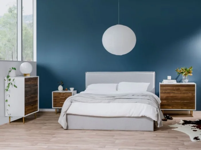 - Меньше — лучше. В спальне не нужен полный гарнитур из семи предметов. Ограничьтесь главным: кровать, система хранения, прикроватные тумбы.