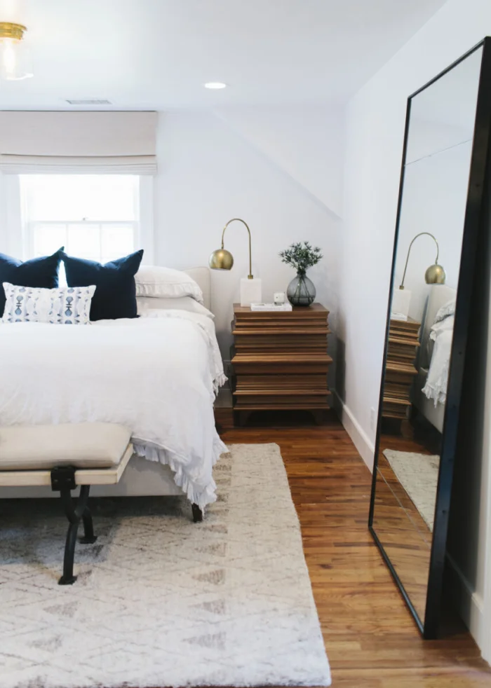Белая мебель — спасение для маленькой спальни. Она буквально растворяется в пространстве.