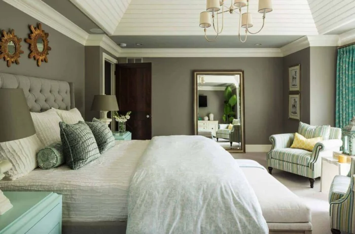Для контраста в пастельной спальне можно добавить мебель с обивкой насыщенного синего или приглушённого золотистого цвета. Если же вы хотите яркий интерьер, саму мебель лучше выбрать в светлых, нейтральных тонах (серый, бежевый), чтобы не перегрузить восприятие.