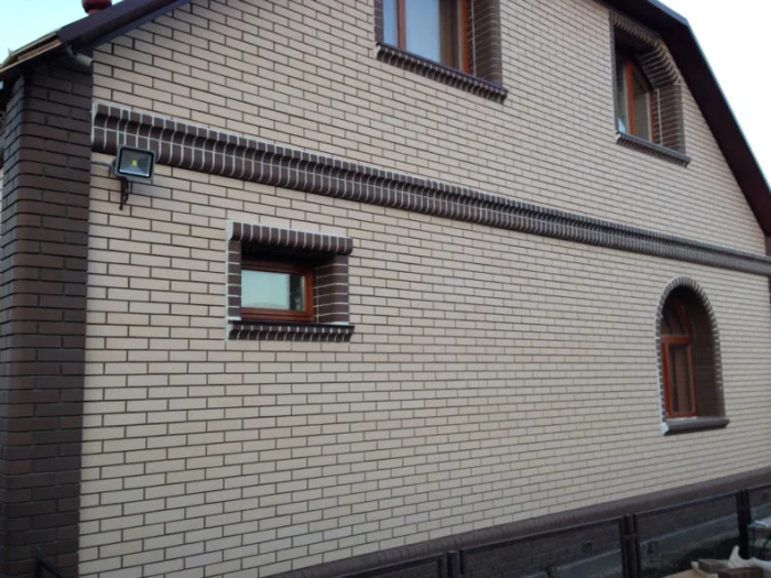 - Навесная система с клинкерными термопанелями. Это не полноразмерный кирпич, а тонкая (20-30 мм) плитка из клинкера, уже смонтированная на пенополиуретановую основу. Крепится на клей-пену и дюбеля к стене. Быстро, эффективно с точки зрения утепления, но дорого и не дает ощущения массивной кладки.