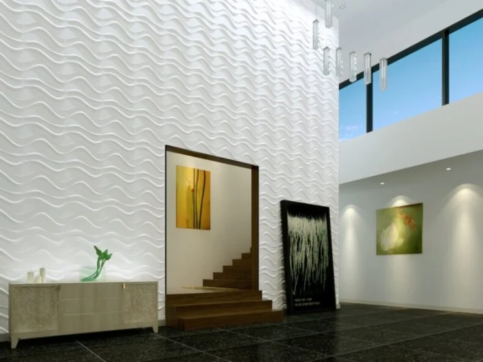 Любимый приём дизайнеров. Игра света и тени на рельефе создаёт невероятный объём. Одна такая стена заменяет собой всю остальную декорацию.