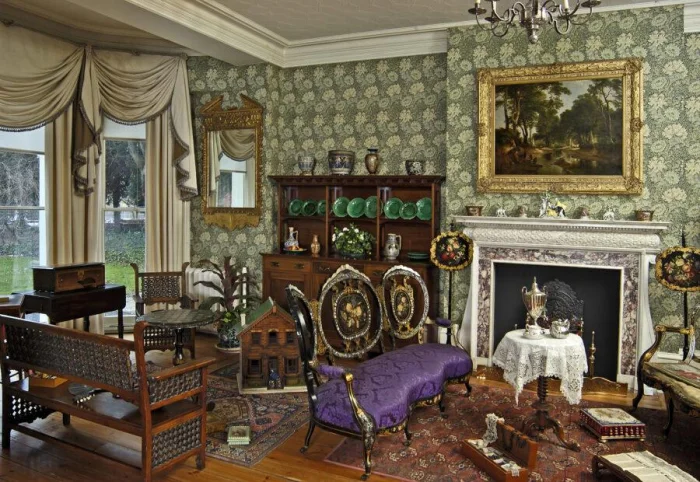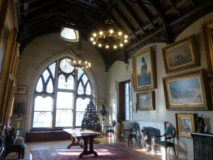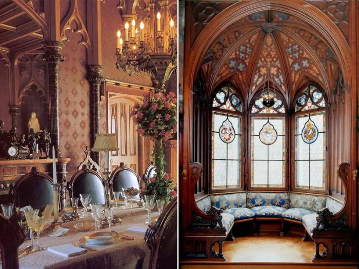 Здесь в ход идёт миниатюризация. Камин может напоминать крошечный замок с башенками. Витраж — быть не только в окне, но и в дверцах шкафа, в столешнице. Сюжеты — рыцари, замки, мифические существа. На стенах — гобелены или картины, стилизованные под средневековую живопись. Шторы — только из плотного, дорогого текстиля: бархат, парча, тяжёлый шёлк.