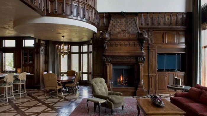 Мебель должна быть монументальной, высокой и безупречного качества. Кровать с балдахином или резным деревянным изголовьем — идеал. На кухне — массивный резной стол и стулья с высокими спинками, буфет с витражными вставками.