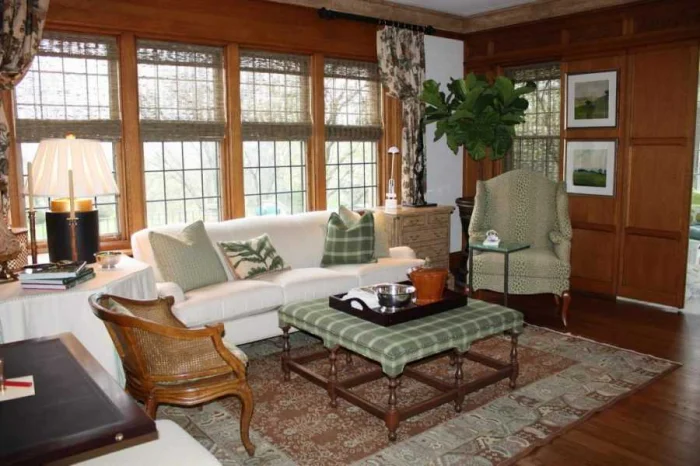 - Для сидения: кресло с тканевой обивкой, знаменитая качалка, плетёные кресла, простые деревянные стулья и даже лавки.