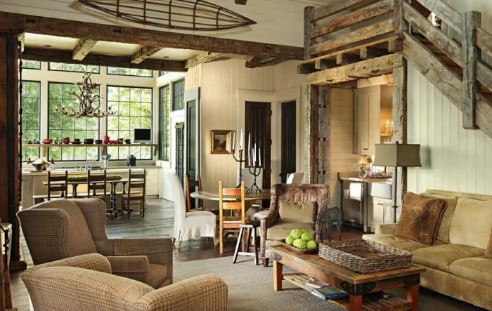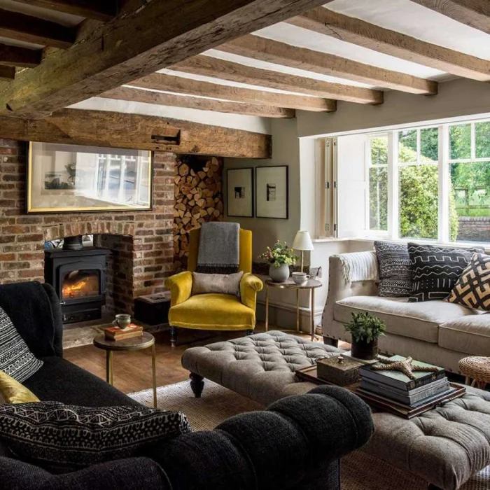 Потолочные балки — мощный штрих. В квартире настоящие тяжёлые балки могут быть небезопасны, но кто мешает использовать лёгкие полиуретановые или картонные имитации? Они выглядят так же убедительно.