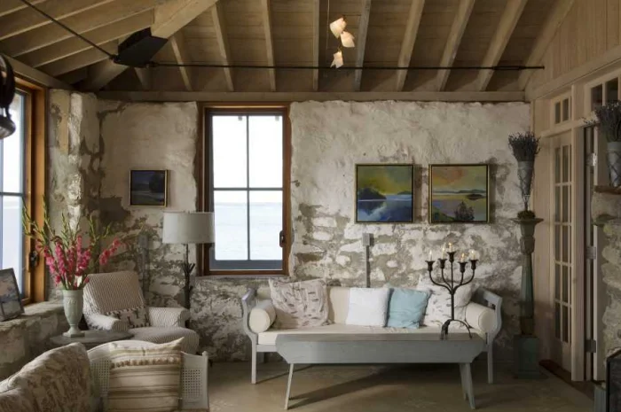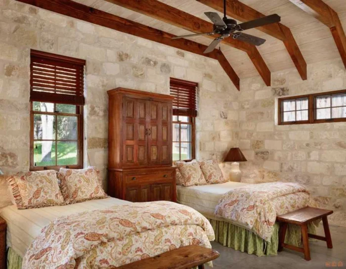 - Потолок: классическая побелка, деревянные балки или натяжное полотно с фактурой древесины.