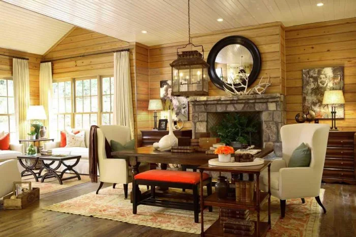Идеальный фон для кантри — это дерево, дерево и ещё раз дерево. В загородном доме из сруба можно смело оставлять естественные стены, пол и потолок. Но в квартире таскать и распиливать массив — сомнительное удовольствие. На помощь приходят умные имитации: