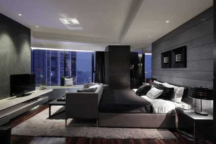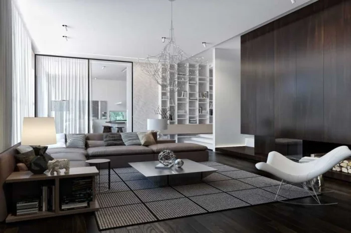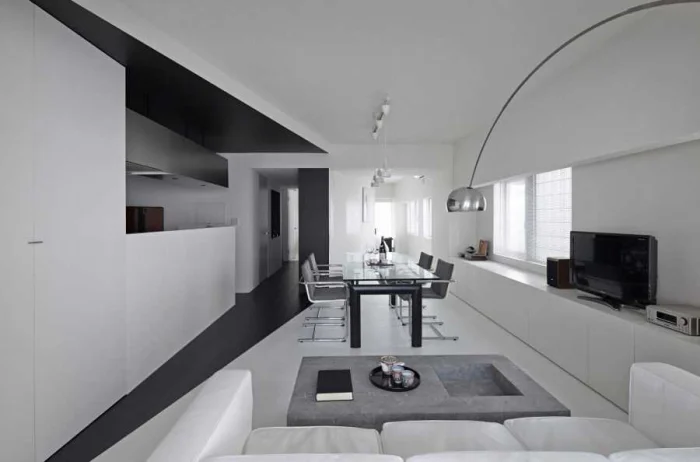 Главное правило: мебель не должна сливаться со стенами. Она обязана контрастировать, создавая чёткие, графичные акценты.