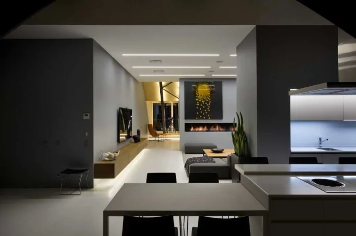 Освещение в хай-теке — отдельный вид искусства. Вычурные люстры с хрустальными подвесками здесь — моветон. Их место занимают: