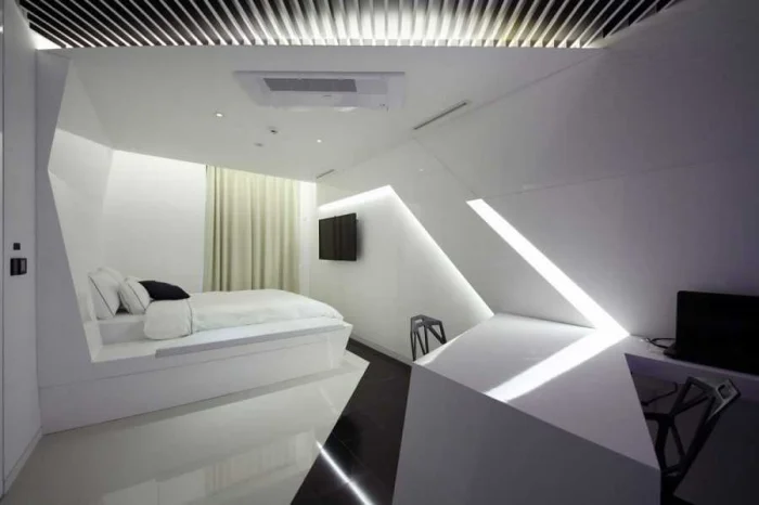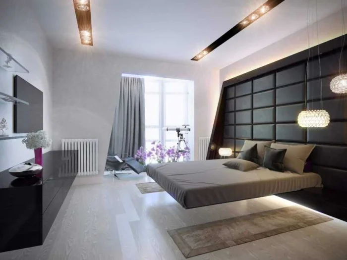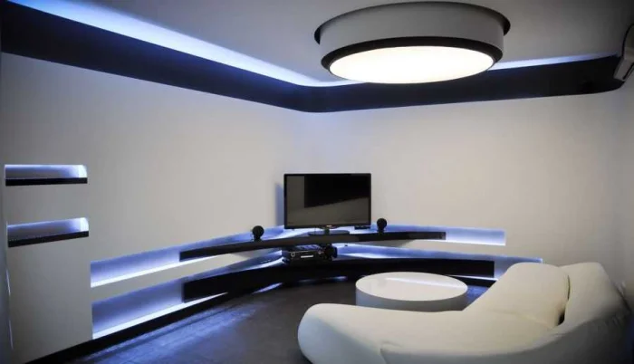 - Скрытые светодиодные панели на стыке стен и потолка.