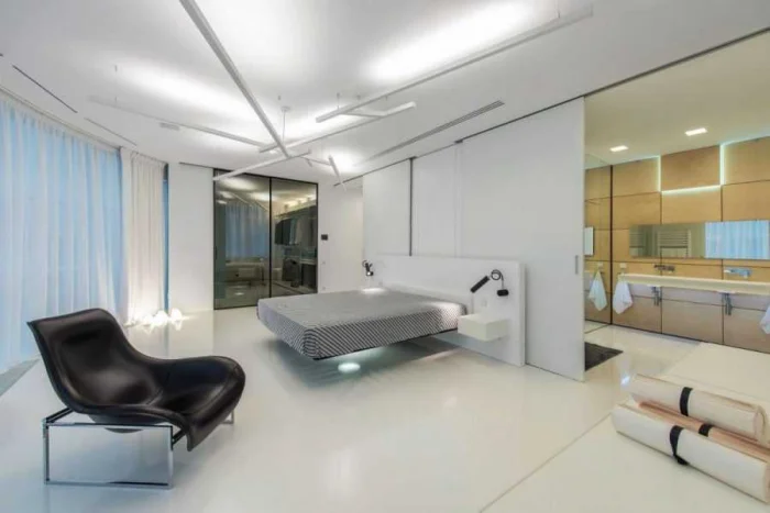 Мебель в хай-теке часто стремится к невидимости. Зачем громоздкий гарнитур, если можно использовать встроенные ниши? Зачем распашные дверцы, если есть раздвижные купе? Прямой кухонный гарнитур часто практичнее углового. А вместо массивного дивана — встроенная в стену откидная кровать.